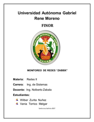 El documento describe el uso de Zabbix para monitorear redes. Se instala Zabbix en una máquina virtual y se configura para monitorear una máquina física mediante la instalación de un agente Zabbix. Esto permite ver información como el uso de memoria de la máquina física de forma remota en la interfaz de Zabbix. El documento también discute los beneficios del monitoreo de redes y otras herramientas populares como Nagios, Zenoss y Monitis.