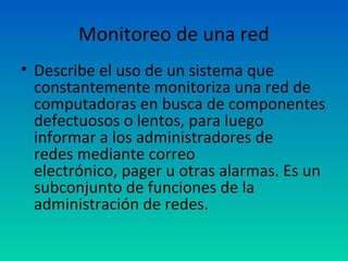 El documento describe los conceptos clave detrás del monitoreo de redes y la administración de redes, incluyendo el monitoreo de componentes de red, la detección y corrección de fallas, y la implementación de políticas y mecanismos de seguridad de red.