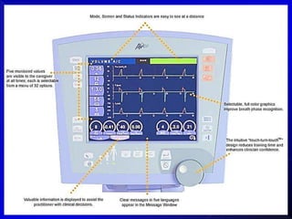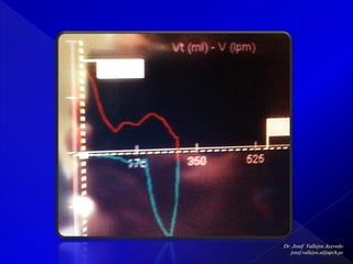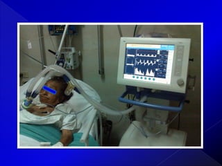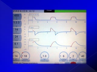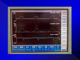 Este documento describe los conceptos básicos de la presión respiratoria, incluyendo la presión atmosférica, presión pleural, presión transpulmonar y presión alveolar. Explica cómo estas presiones cambian durante la inspiración y espiración y cómo se relacionan entre sí. También describe brevemente los modos de ventilación mecánica VCM y PCV y diferentes parámetros que deben monitorearse como la curva presión-tiempo, formas de onda de flujo, tiempos inspiratorio y espiratorio, y volumen cor
