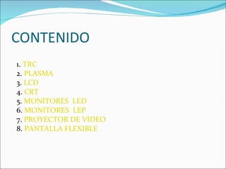 Este documento describe diferentes tipos de monitores, incluyendo TRC, plasma, LCD, CRT, LED, LEP y proyectores de video. Explica cómo funcionan TRC y CRT, y destaca las características de pantallas plasma, LCD, LED y LEP. También cubre pantallas flexibles y proyectores de video. Concluye que los monitores son objetos diseñados para ser usados de forma segura por múltiples hilos de ejecución simultáneamente.