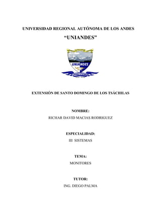 Este documento describe la evolución de los monitores desde los primeros monitores monocromáticos MDA hasta los monitores modernos de alta definición. Explica los diferentes estándares de monitores como CGA, EGA, VGA y SVGA y cómo han ido mejorando las resoluciones y colores con el tiempo. También clasifica los monitores según su tecnología, describiendo monitores CRT, LCD, plasma y sus respectivos principios de funcionamiento y ventajas/desventajas.