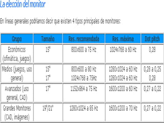 Este documento describe diferentes tipos de monitores, incluyendo monitores a color, monocromáticos, de cristal líquido y con tubos de rayos catódicos. Explica que los monitores a color usan tres capas de fósforo y cañones de electrones, uno para cada color primario, y que los monitores monocromáticos muestran un solo color. Además, detalla el funcionamiento de los monitores LCD mediante cristales líquidos y filtros polarizados, y cómo los monitores CRT reciben señ