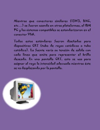 Este documento describe los diferentes tipos de monitores analógicos y digitales, como los monitores CRT y LCD. Explica que los monitores CRT usan señales de video analógicas para generar colores, mientras que los monitores LCD digitalizan completamente las señales antes de la visualización. También compara las ventajas e inconvenientes de ambos tipos de monitores y proporciona detalles técnicos sobre sus especificaciones y funcionamiento.