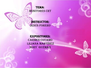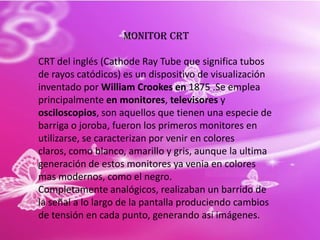 Este documento describe los componentes internos y el funcionamiento de los monitores CRT. Los monitores CRT utilizan un tubo de rayos catódicos que dispara un haz de electrones contra una pantalla recubierta de fósforo para crear imágenes. El documento explica los componentes clave como el cañón electrónico, las bobinas de deflexión, el flyback y el oscilador horizontal, y describe cómo estos trabajan juntos para mostrar una imagen en la pantalla. También identifica algunos problemas comunes como fallas en el chip vertical u horizontal y en