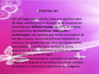 MONITOR CRTCRT delinglés (Cathode Ray Tube que significa tubos de rayos catódicos) es un dispositivo de visualización inventado por William Crookes en 1875 .Se emplea principalmente en monitores, televisores y osciloscopios, son aquellos que tienen una especie de barriga o joroba, fueron los primeros monitores en utilizarse, se caracterizan por venir en colores claros, como blanco, amarillo y gris, aunque la ultima generación de estos monitores ya venia en colores mas modernos, como el negro.Completamente analógicos, realizaban un barrido de la señal a lo largo de la pantalla produciendo cambios de tensión en cada punto, generando así imágenes.