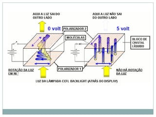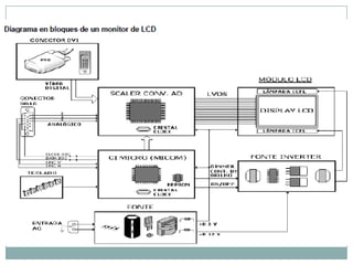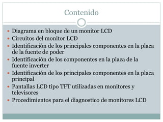 Este documento presenta información sobre el diagnóstico de fallas en monitores LCD. Explica los componentes clave de un monitor LCD como la placa de fuente de poder, la placa de la fuente inverter y la placa principal. También describe los tipos de pantallas LCD utilizadas, incluidas las pantallas TFT, y los procedimientos para diagnosticar problemas comunes en monitores LCD.
