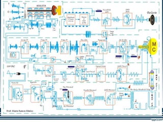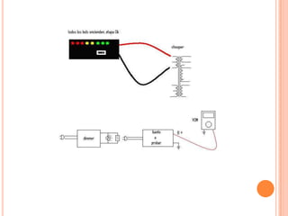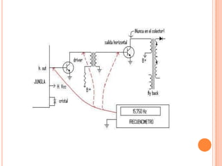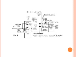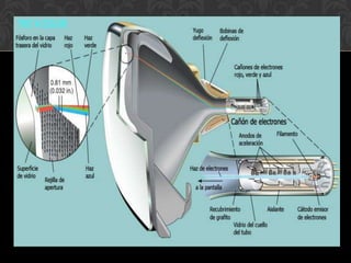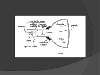 Este documento describe los principales componentes de un monitor de televisión. Explica que un monitor está compuesto por un tubo de rayos catódicos que dispara un haz de electrones hacia una pantalla, y describe los componentes clave como el cañón electrónico, las bobinas de deflexión, la fuente de alimentación y los circuitos de video y color. También explica brevemente cómo funciona cada uno de estos componentes para producir una imagen en la pantalla.
