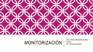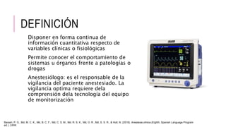 Este documento describe los diferentes métodos de monitoreo anestésico, incluyendo la oxigenación, ventilación, circulación y temperatura. Explica cómo el electrocardiograma, la presión arterial invasiva y no invasiva, el catéter venoso central y el catéter de arteria pulmonar se usan para monitorear la circulación. También cubre el monitoreo de la presión venosa central y el gasto cardiaco.
