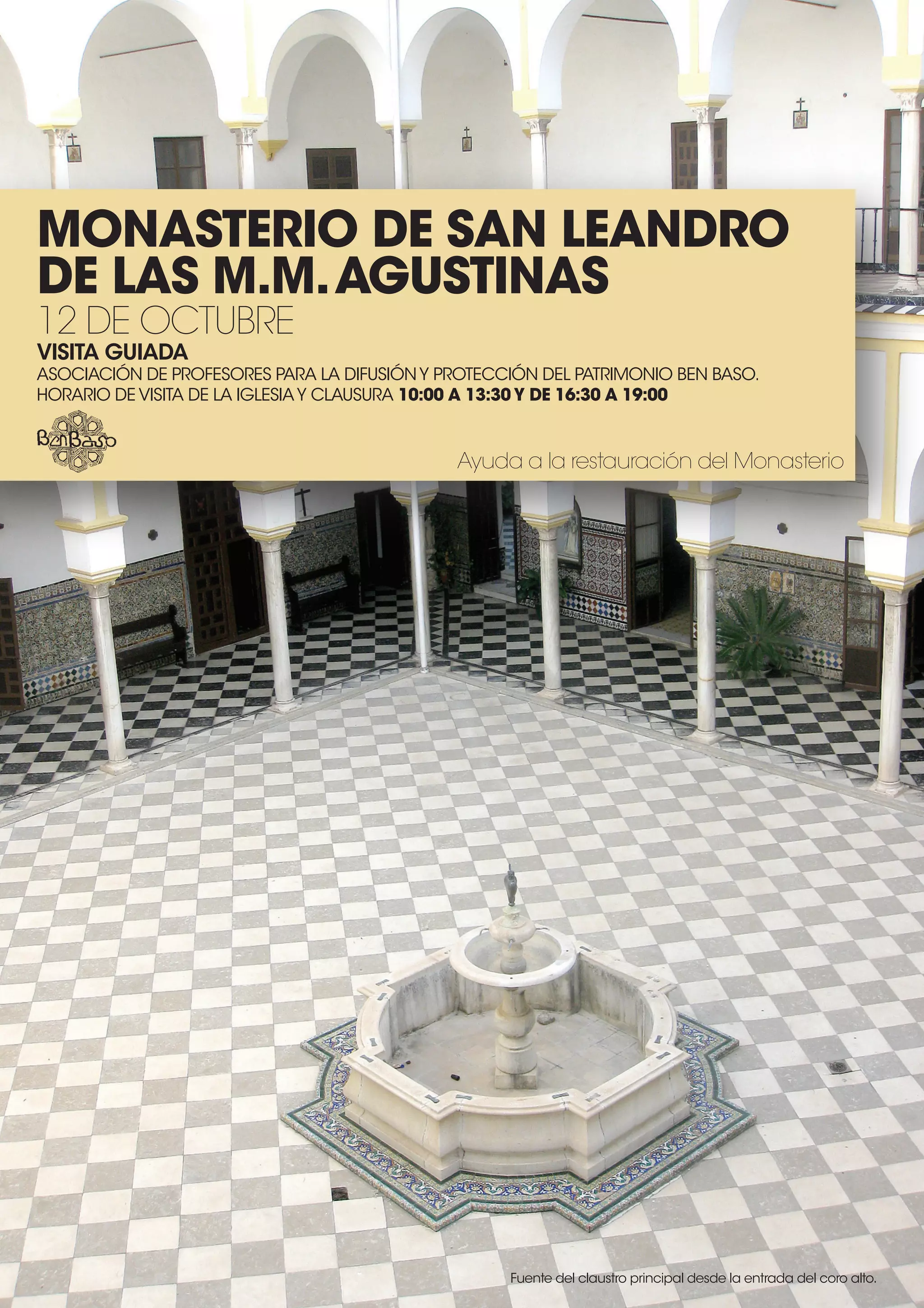 El documento proporciona información sobre una visita guiada al Monasterio de san Leandro de Las M.M. agustinas el 12 de octubre. Incluye el horario de visita a la iglesia y clausura de 10:00 a 13:30 y de 16:30 a 19:00. También menciona que la Asociación de Profesores para la difusión y Protección del Patrimonio Ben Bajo está ayudando a restaurar el monasterio.