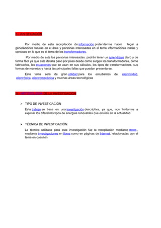 Este documento describe los componentes y funcionamiento básico de un transformador eléctrico. Un transformador consta de dos bobinas acopladas magnéticamente alrededor de un núcleo de hierro. Cuando se aplica una corriente alterna a la bobina primaria, se induce una tensión en la bobina secundaria debido al acoplamiento magnético. El número de vueltas de cada bobina determina si el transformador aumenta o reduce la tensión. Los transformadores permiten transmitir energía eléctrica a largas distancias de forma eficiente.