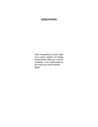 Este documento presenta una monografía sobre circuitos eléctricos escrita por Eder David Cheme Cheme para el Colegio Nacional Eloy Alfaro. La monografía incluye una dedicatoria, agradecimientos, justificación, objetivos y esquema. Explica conceptos básicos sobre circuitos eléctricos como corriente continua, corriente alterna, componentes eléctricos y electrónicos, y configuraciones en serie y paralelo. También cubre las leyes de Kirchhoff, la ley de Ohm, y los te