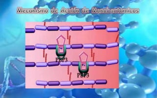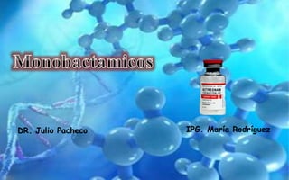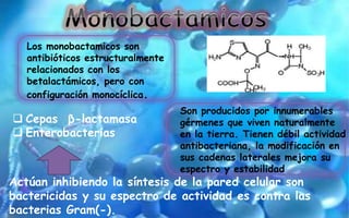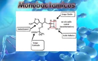 Los monobactámicos son antibióticos relacionados con los betalactámicos pero de configuración monocíclica. Se producen naturalmente por bacterias del suelo y tienen débil actividad antibacteriana, aunque modificaciones en sus cadenas laterales mejoran su espectro y estabilidad. Actúan inhibiendo la síntesis de la pared celular bacteriana de forma bactericida contra bacterias Gram-negativas.