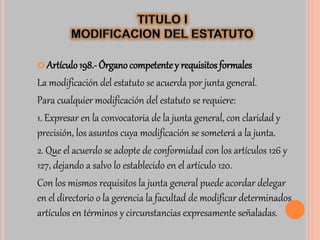 El documento establece los requisitos y formalidades para modificar, aumentar y reducir el capital de una sociedad anónima. Para la modificación del estatuto, aumento o reducción del capital, se requiere un acuerdo de la junta general cumpliendo con los mismos requisitos formales. Estos cambios deben constar en escritura pública e inscribirse en el registro, afectando a todos los accionistas por igual.