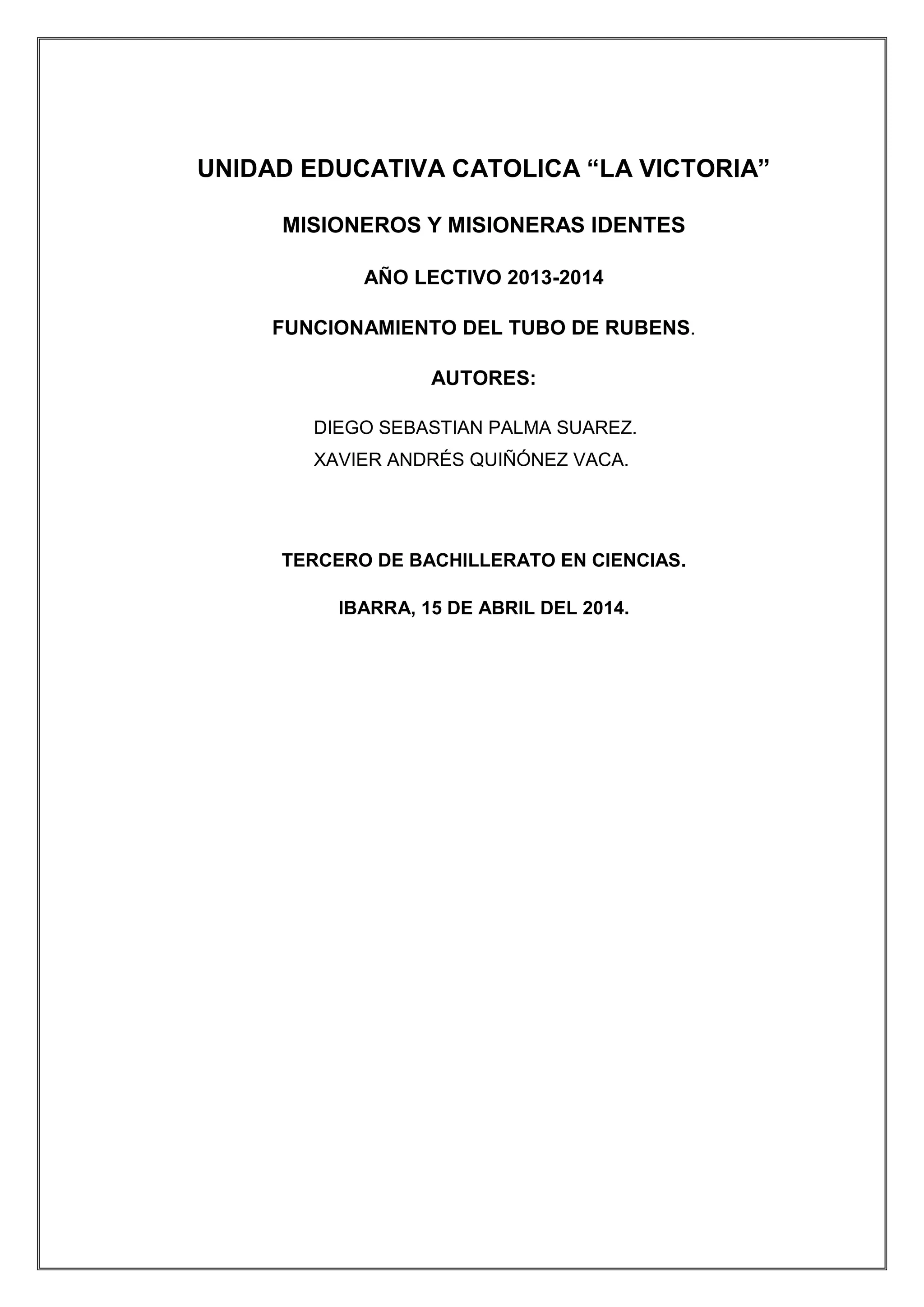 Este documento describe la construcción y funcionamiento del tubo de Rubens. El tubo de Rubens permite visualizar ondas sonoras de diferentes frecuencias y amplitudes mediante las variaciones en las llamas de un gas que se enciende a lo largo del tubo. El documento explica la historia del tubo de Rubens y cómo funciona para mostrar ondas sonoras visualmente. Además, incluye secciones sobre la teoría del sonido y ondas, y los pasos para construir un tubo de Rubens.
