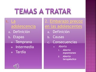 El documento trata sobre el embarazo precoz en las adolescentes. Resume que el embarazo precoz ocurre en adolescentes menores de 19 años antes de alcanzar la madurez emocional, y puede ser causado por incesto, abuso sexual o violación. Las consecuencias incluyen aborto espontáneo o terapéutico, así como dificultades para la madre y el hijo adolescente.