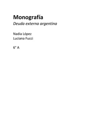 Este documento resume la historia de la deuda externa argentina desde la década de 1970 hasta el gobierno de Alfonsín en la década de 1980. Explica que la deuda externa creció drásticamente durante la dictadura militar de 1976-1983 debido a la abundancia de créditos internacionales. Para 1980, la deuda había llevado a una crisis financiera. Aunque la democracia se restauró en 1983, Alfonsín heredó una deuda externa de $45 mil millones que representaba el 8% del PBI an
