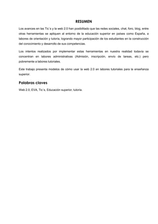 Este documento presenta modelos de cómo usar herramientas de la web 2.0 en labores tutoriales en entornos virtuales de aprendizaje. Expone que las redes sociales, chats y otros recursos se han aplicado con éxito en países europeos para mejorar la participación estudiantil y el desarrollo de competencias. Sin embargo, en nuestra realidad estas herramientas se usan poco para la tutoría. Finalmente, propone algunos modelos para aplicar la web 2.0 a labores tutoriales en educación superior de manera presencial y en línea.
