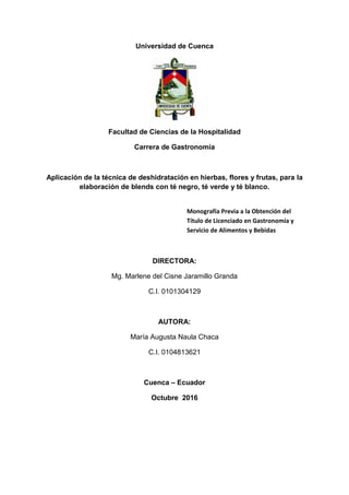 Este documento presenta un resumen de la monografía previa a la obtención del título de Licenciado en Gastronomía y Servicio de Alimentos y Bebidas de la Universidad de Cuenca. La autora realizó una investigación sobre la aplicación de la técnica de deshidratación en hierbas, flores y frutas para la elaboración de blends con té negro, té verde y té blanco. Se seleccionaron diversas materias primas y se describen sus propiedades. Luego se explica el proceso de deshidratación y se present