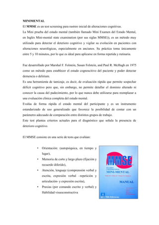 El documento proporciona información sobre cinco pruebas abreviadas de evaluación neuropsicológica: Mini-Mental, Neuropsi, Evaluación de las afasias Mi Alfa, MoCA y ACE-R. Resume los objetivos, componentes y áreas cognitivas evaluadas por cada prueba. Además, describe brevemente las regiones cerebrales asociadas a cada tipo de prueba neuropsicológica.