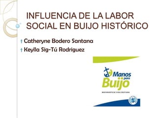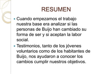 El documento analiza la influencia de la labor social que realizan jóvenes voluntarios de Guayaquil en la comunidad de Buijo Histórico. A través de encuestas y testimonios, se demuestra que los habitantes de Buijo han cambiado positivamente y aceptan las actividades como los talleres que ofrecen los voluntarios. El objetivo principal es compartir valores cristianos e inspirar ese estilo de vida en la comunidad a través de la ayuda que brindan.