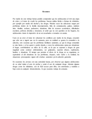 El documento resume las causas y consecuencias de la drogadicción en adolescentes en dos centros de rehabilitación en Santo Domingo. Señala que muchos adolescentes recurren a las drogas para evadir problemas familiares como maltrato o falta de comunicación. Esto los lleva a la adicción y puede causar que abandonen su hogar y se conviertan en niños de la calle. El tratamiento en los centros busca ayudarlos a dejar el consumo compulsivo de drogas y tratar otros problemas asociados mediante terapias conductuales, medicamentos y