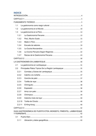 Este documento presenta un resumen de la gastronomía de la región de Lambayeque en el Perú. En el capítulo 1, se define la gastronomía como un rasgo cultural y se describe brevemente la gastronomía en el mundo y en el Perú. En el capítulo 2, se describen los principales platos típicos de la región de Lambayeque. Finalmente, en el capítulo 3, se presenta una guía gastronómica de los distritos de Puerto Eten, Monsefú, Pimentel, Lambayeque y Ferreñafe,