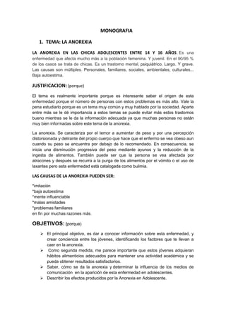 Este documento trata sobre la anorexia en chicas adolescentes entre 14 y 16 años. Explica que la anorexia es un trastorno mental y físico grave que afecta principalmente a las chicas y que tiene múltiples causas como baja autoestima, imitación, malas amistades y problemas familiares. Los objetivos son dar información sobre la enfermedad, crear conciencia sobre los factores de riesgo, y describir los efectos de la anorexia en las adolescentes.