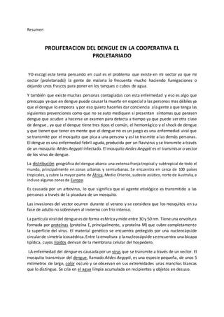 El documento trata sobre la proliferación del dengue en la Cooperativa El Proletariado. Explica que el dengue es una enfermedad viral transmitida por mosquitos que afecta a muchas personas en la comunidad. El objetivo es diseñar un plan educativo para crear conciencia sobre la prevención del dengue y reducir los casos, a través de campañas para eliminar criaderos de mosquitos y acudir al médico ante los síntomas. El dengue es un problema de salud pública importante debido al gran número de personas infectadas cada año y las posibles complic