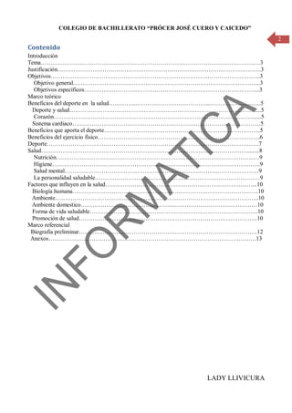 Este documento trata sobre la importancia del deporte en la salud del ser humano. Explica que practicar deporte de forma regular proporciona numerosos beneficios para la salud física y mental, como mejorar el sistema cardiovascular, reducir el estrés, aumentar la autoestima y prevenir enfermedades. También define conceptos clave como salud, ejercicio físico y deporte, y describe los factores que influyen en la salud como la biología humana, el ambiente y el estilo de vida.