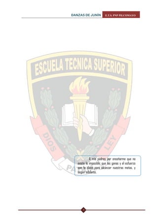 Este documento describe varias danzas tradicionales del departamento de Junín en Perú. Algunas de las danzas destacadas son la danza de Junín Anti, la danza de los Auquines de Matahuasi, y la Chonguinada, que es una danza de ofrenda patronal que se practica en fiestas religiosas. El documento también proporciona detalles sobre el significado y vestimenta de algunas de estas danzas folclóricas de Junín.