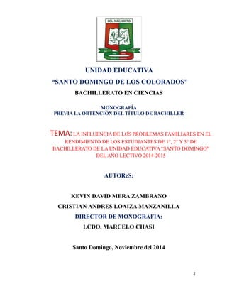 Este documento presenta una monografía que investiga la influencia de los problemas familiares en el rendimiento académico de estudiantes de primero, segundo y tercer año de bachillerato. La monografía busca vincular el rendimiento escolar con el funcionamiento familiar. El objetivo es considerar factores externos como la calidad del clima familiar y cómo esto puede afectar negativamente el desarrollo del estudiante y su desempeño en la escuela. La investigación justifica examinar este tema desde una perspectiva teórica y práctica