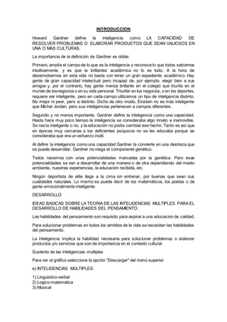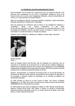 Este documento resume la teoría de las inteligencias múltiples de Howard Gardner, la cual propone que las personas tienen al menos ocho tipos diferentes de inteligencia en lugar de una sola inteligencia general. El documento también discute cómo los sistemas educativos tradicionales se centran principalmente en las inteligencias lingüística y lógico-matemática y sugiere que se debe dar más importancia a las otras inteligencias identificadas por Gardner.
