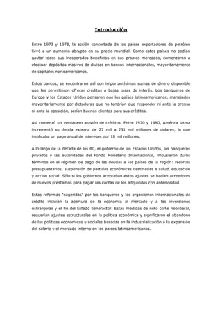 Este documento presenta una monografía sobre la deuda externa argentina escrita por la alumna Sol Curcio para su profesora Alicia Barba. Comienza describiendo cómo los países latinoamericanos se endeudaron masivamente entre 1970 y 1980 debido a la disponibilidad de créditos baratos de bancos estadounidenses y europeos. Luego analiza la evolución de la deuda externa argentina desde 1824, destacando periodos de default y reestructuraciones. Finalmente, examina los efectos de la crisis de la deuda de los años
