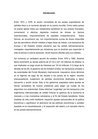 Este documento presenta información sobre la deuda externa de Argentina a lo largo de la historia. Comienza describiendo cómo la deuda externa de Argentina se originó en 1824 con el primer préstamo contraído con una firma inglesa. Luego analiza cómo la deuda creció fuertemente a partir de la década de 1970 debido a la abundancia de créditos internacionales, pero los fondos no se usaron para el desarrollo sino para otros fines no productivos. Finalmente, explica cómo la sobrecarga de deuda llevó a Argentina a declarar default