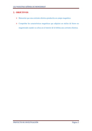 El documento describe un proyecto de investigación sobre electroimanes. Explica que un electroimán es un imán cuyo campo magnético se produce por la corriente eléctrica que pasa por una bobina. Los objetivos son demostrar que la corriente produce un campo magnético y comprobar las propiedades magnéticas de un núcleo de hierro con corriente. También resume los conceptos teóricos sobre imanes, campos magnéticos y la construcción de electroimanes.