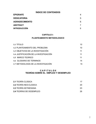 Este documento presenta el planteamiento metodológico de un trabajo de investigación sobre los factores que determinan el empleo en Perú entre 2003-2008. Incluye el título, planteamiento del problema, objetivos, justificación, marco teórico, glosario de términos y metodología. Aborda teorías clásicas, neoclásicas y keynesianas sobre empleo y desempleo. Presenta índices de contenido detallado para cada uno de los 4 capítulos que componen el trabajo.