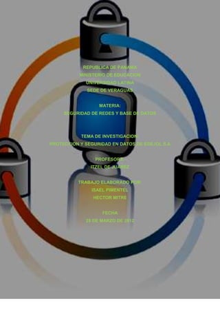 Este documento describe la investigación sobre la protección y seguridad de datos en la empresa EDEJOL S.A. Analiza las vulnerabilidades actuales como la pérdida de documentos y falta de protección de la privacidad. El objetivo es conocer los mecanismos y protocolos de seguridad de EDEJOL para proteger los datos de la empresa y empleados. Propone soluciones como encriptación de datos, cámaras de vigilancia y cortafuegos.