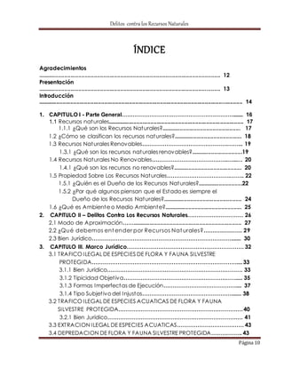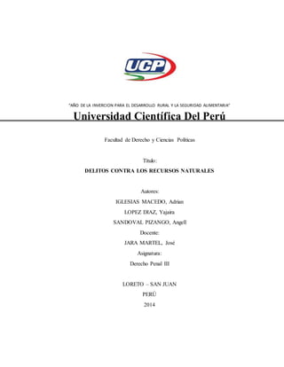 Este documento presenta un resumen de los delitos contra los recursos naturales en Perú. En la introducción, describe brevemente el marco jurídico de los delitos ambientales en el Código Penal peruano. Luego, en la parte general, define conceptos clave como recursos naturales renovables y no renovables, y analiza aspectos como la propiedad sobre los recursos naturales y el medio ambiente. Finalmente, en la parte especial, examina en detalle cada uno de los delitos contra los recursos naturales establecidos en la legislación peruana.