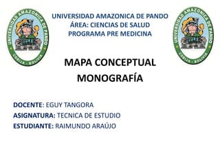 Este documento presenta un mapa conceptual sobre los tipos de monografías, incluyendo compilación, análisis e investigación. Explica que una monografía consta de tres partes: preliminares, cuerpo y complementos. Dentro de las preliminares se encuentran la portada, introducción y referencias bibliográficas. El cuerpo contiene el desarrollo y la conclusión del tema.