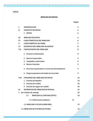 Este documento proporciona información sobre el mercado de divisas (FOREX). Explica que el FOREX es el mercado financiero más grande del mundo donde se intercambian divisas las 24 horas. Los participantes incluyen bancos comerciales, compañías, bancos centrales e inversores individuales. También describe los diferentes segmentos del mercado como los mercados al contado, a plazo, de futuros y de opciones.