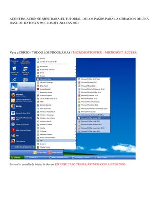 Este documento proporciona instrucciones paso a paso para crear una base de datos en Microsoft Access 2003, incluyendo cómo crear tablas, formularios e implementar relaciones entre tablas. Explica cómo utilizar el asistente para crear tablas y formularios de manera rápida, y también cómo crearlos manualmente en modo de diseño para tener más control sobre su estructura y apariencia. Además, describe cómo vincular tablas mediante claves primarias y generar un menú de navegación para acceder a los diferentes formularios creados.