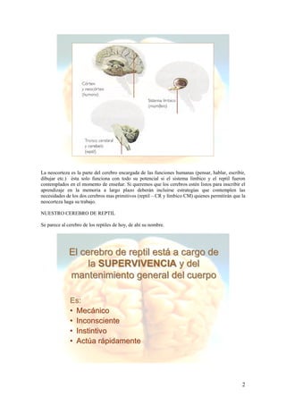 El documento describe las tres partes principales del cerebro humano según la teoría del cerebro triuno: el cerebro de reptil, el cerebro límbico, y la neocorteza. Explica que el cerebro de reptil se encarga de la supervivencia física y el mantenimiento del cuerpo, el cerebro límbico genera las emociones y los vínculos sociales, y la neocorteza es responsable de las funciones cognitivas superiores como el pensamiento y el lenguaje. También discute cómo cada parte del cerebro afecta el aprendiz