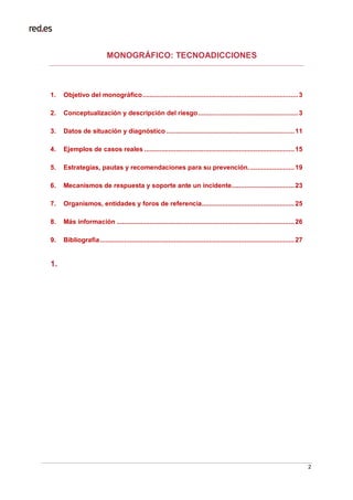 Este documento presenta información sobre las tecnoadicciones. Define las tecnoadicciones como una dependencia excesiva del uso de la tecnología que limita la libertad de la persona. Describe los síntomas de las tecnoadicciones como la tolerancia, el síndrome de abstinencia y la pérdida de control. También identifica factores de riesgo personales como la impulsividad y factores familiares como un estilo parental autoritario o permisivo. El objetivo es crear conciencia sobre este riesgo emergente para los menores