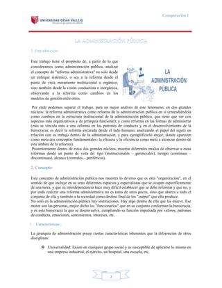Este documento presenta información sobre el curso de Computación I impartido en la Universidad César Vallejo. Incluye 7 secciones que describen: 1) la introducción al curso, 2) el concepto de administración pública, 3) las características de la administración, 4) las funciones del estado, 5) las clases de descentralización administrativa, 6) la estructura de la administración pública central y descentralizada, y 7) los principios de la administración.