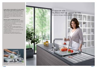 El sistema Blanco Hot proporciona agua caliente instantánea a temperaturas regulables entre 65°C y el punto de ebullición, facilitando diversas tareas en la cocina moderna como cocinar, limpiar y calentar. Con un diseño elegante y funcional, incluye características de seguridad como un seguro infantil y un sistema anti-goteo para evitar la acumulación de gérmenes. Su instalación es sencilla y sin necesidad de grupos de seguridad adicionales, optimizando el espacio en las cocinas.