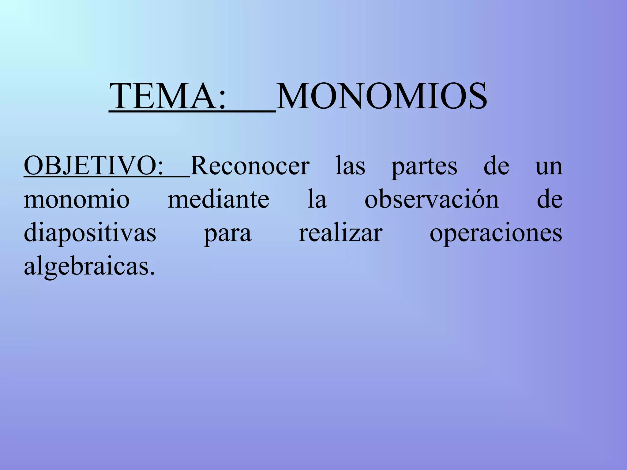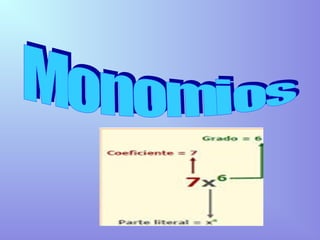 El documento habla sobre monomios. Explica que un monomio es una expresión algebraica con solo letras y potencias unidas por multiplicación. Identifica las partes de un monomio como el coeficiente, la parte literal y el grado. Finalmente describe dos tipos de monomios: semejantes que tienen la misma parte literal y opuestos que son semejantes pero con coeficientes opuestos.