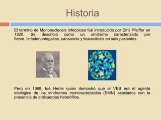 Este documento describe la mononucleosis infecciosa causada por el virus de Epstein-Barr. El virus infecta principalmente las células nasofaríngeas y linfocitos B, causando síntomas como fiebre, dolor de garganta, fatiga, adenopatías y esplenomegalia. El diagnóstico se realiza mediante la detección de anticuerpos heterófilos o anticuerpos contra antígenos del virus de Epstein-Barr.