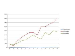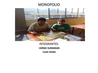 El documento presenta un resumen de un juego de Monopolio entre dos integrantes, Jorge Sumaran y Luis Vivas. Muestra las ganancias de cada uno a lo largo de 13 turnos, con Jorge Sumaran acumulando alrededor de $4000 y Luis Vivas alrededor de $2500.