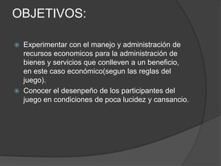 Este informe describe una partida del juego Monopolio jugada por 4 estudiantes y un invitado de la Facultad de Ingeniería Civil. Los objetivos del juego fueron experimentar la administración de recursos económicos y conocer el desempeño de los participantes en condiciones de cansancio. Se detalla la pieza que representó a cada jugador y la evolución del juego en términos de tiempo y dinero. Como conclusión, se señala que la estrategia debe considerar evitar que otros obtengan monopolios y comprar propiedades inicialmente