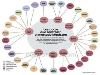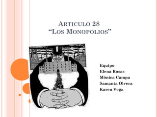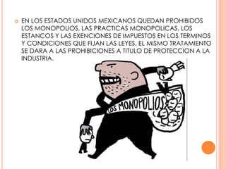 Este documento describe la prohibición de monopolios en México y las regulaciones antimonopolio. Establece que los monopolios, prácticas monopólicas y exenciones de impuestos están prohibidos, y que las leyes castigarán severamente la concentración de artículos de consumo necesario con el objetivo de elevar precios. También prohíbe acuerdos entre productores, industriales y comerciantes destinados a evitar la competencia o forzar precios exagerados al consumidor. Finalmente, enumera algunas excepciones como funciones estatales estr